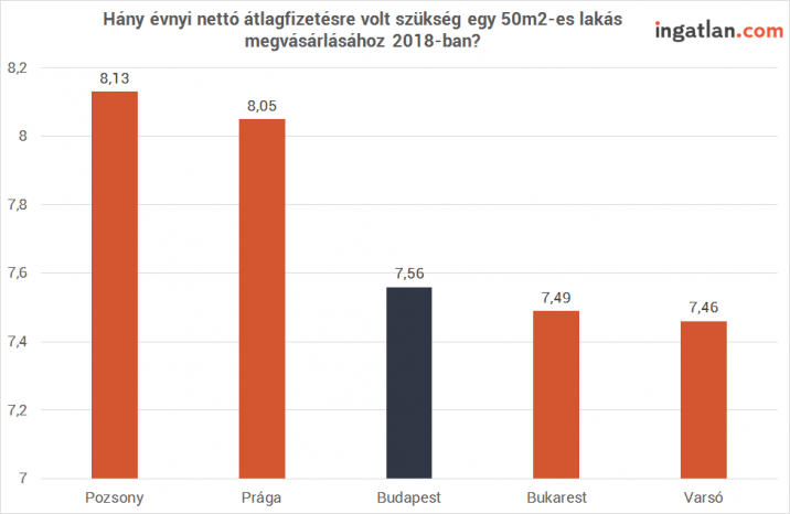 - Egy ötven négyzetméteres budapesti lakás a tavalyi átlagárakon 7,5 éves nettó fizetésből jött ki. Varsóban és Bukarestben szintén 7,5 év kellett hozzá, ezzel szemben Prágában és Pozsonyban több mint 8 évre volt szükség.