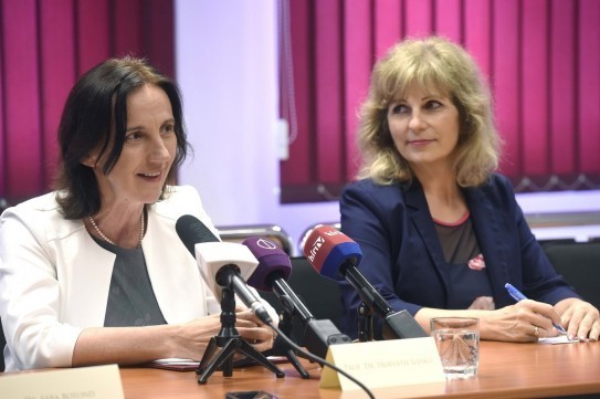 Horváth Ildikó, az Emberi Erőforrások Minisztériumának (Emmi) egészségügyért felelős államtitkára (b) és Bábiné Szottfried Gabriella, az Egészségügyi Szakmai Kollégium védőnői tagozatának vezetője sajtótájékoztatót tart a védőnők fizetésemeléséről a Józsefvárosi Szent Kozma Egészségügyi Központban 2019. augusztus 8-án. Mintegy négyezer védőnő kap emelt fizetést a napokban, amely a védőnők többéves bérrendezési programjában az első emelt összegű kifizetés. MTI/Bruzák Noémi